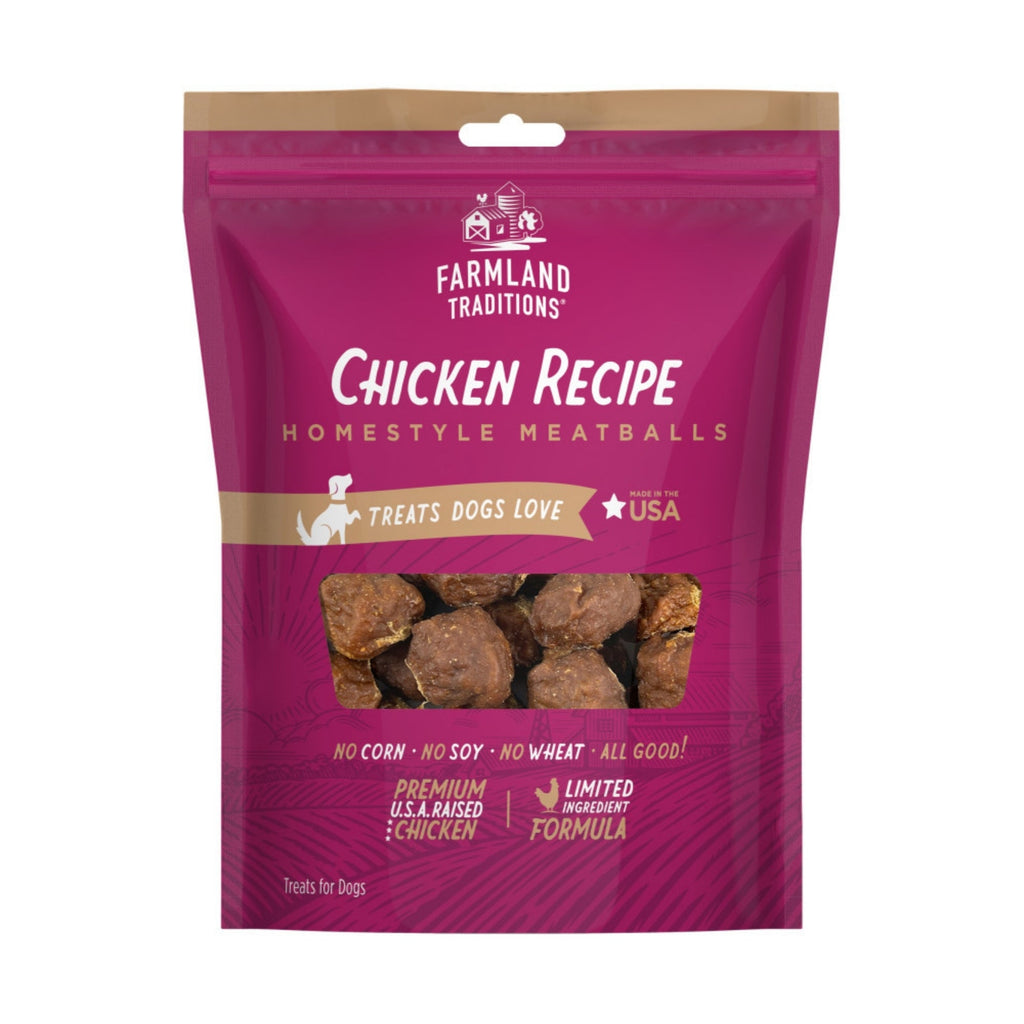 Farmland Traditions homestyle meatballs are made in our own U.S. facility using USA raised chicken. Our simple recipe treats contain no corn, wheat, or soy for a taste your dog is sure to love!