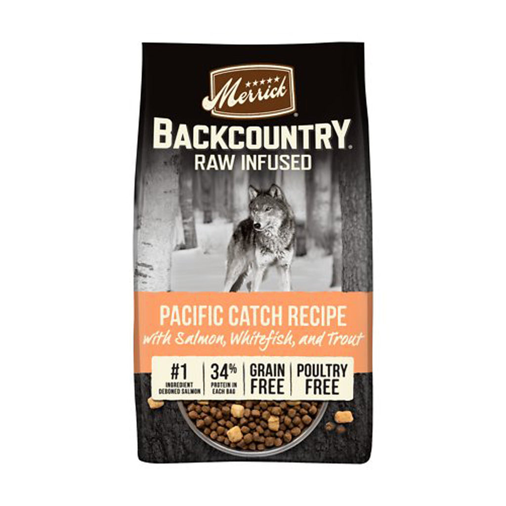 Take your dog's taste buds on a trip to the coast with Merrick Backcountry Freeze-Dried Raw Pacific Catch Recipe with Salmon, Whitefish & Trout. This grain-free dried dog food features real deboned salmon as the very first ingredient. It's also made with whitefish and trout for a protein-rich and highly digestible, poultry-free formula your dog will love. This dog food combines freeze-dried raw-coated kibble and freeze-dried raw bites to give your buddy all the benefits of a raw diet. Its developed with high levels of omega fatty acids to help promote healthy skin and a shiny coat while glucosamine and chondroitin support healthy hips and joints. And just like other Merrick recipes, this food is crafted in their Hereford, Texas Kitchen and cooked in the USA.